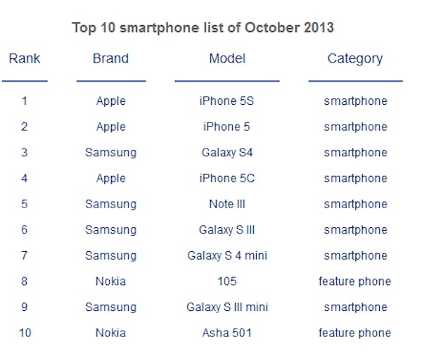 Điều đặc biệt là cả hai mẫu điện thoại giá rẻ của Nokia là Nokia 105 và Nokia Asha 501 cũng có mặt trong danh sách. Mặc dù Nokia Lumia 520 cũng được bán khá chạy ở các nước thuộc châu Âu, Mỹ, và châu Á trong tháng 10 tuy nhiên nó lại không xuất hiện trong danh sách này theo nhận xét của nhà thống kê.